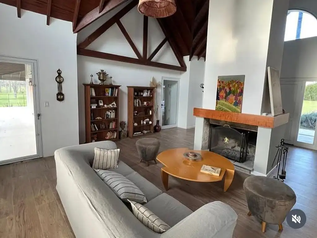 Generoso living con hogar a leña y vistas al parque.