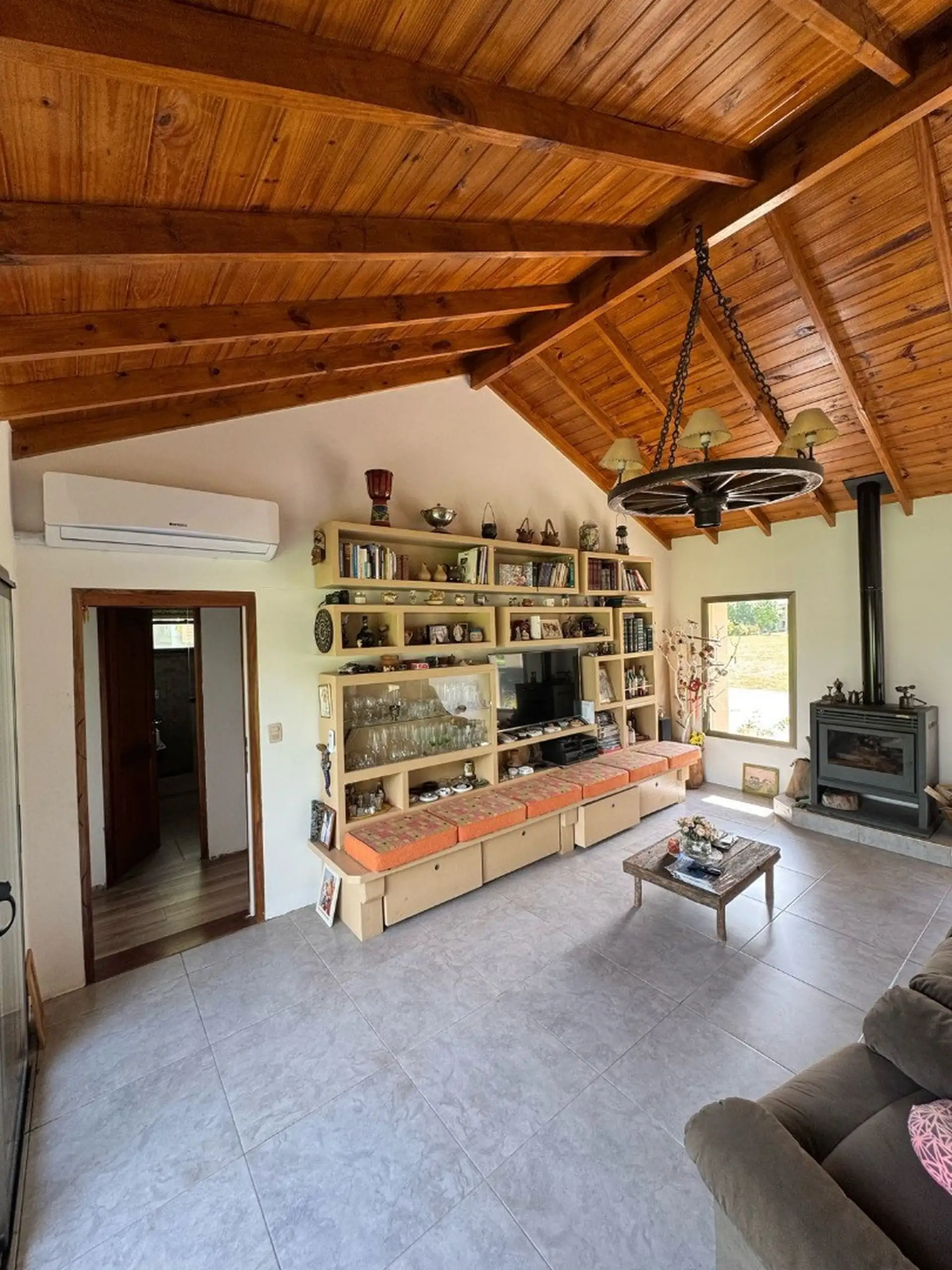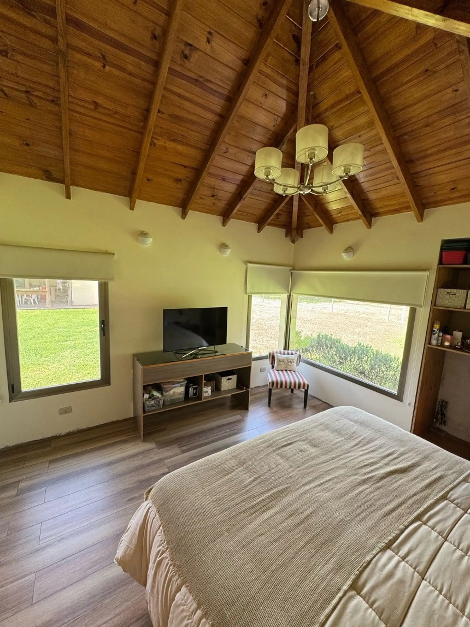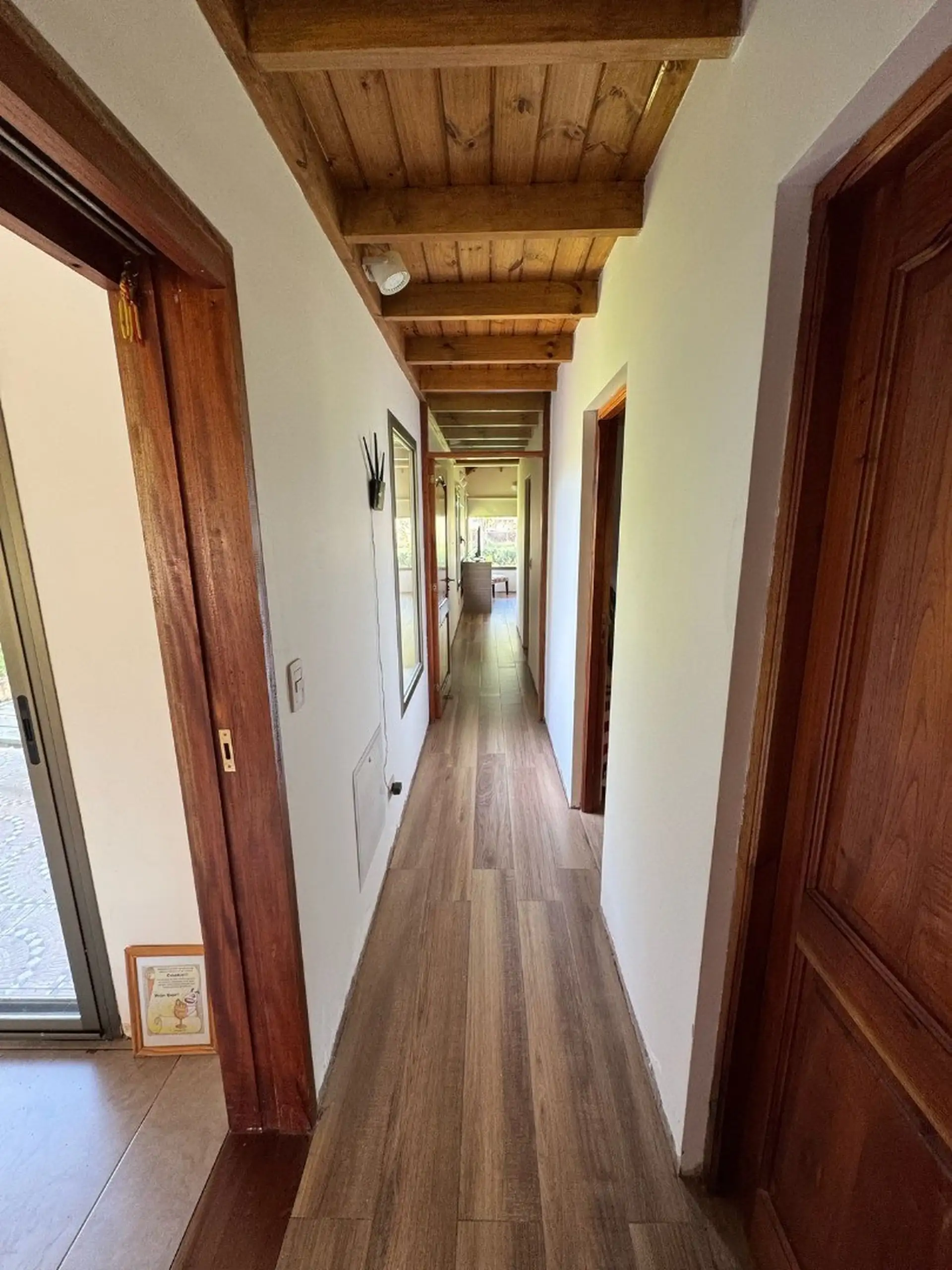 Al ingresar nos encontramos con el living, el cual tiene un amplio ventanal con vista al parque verde, hogar a leña, a la derecha se encuentra los dos dormitorios con baño compartimentado y el dormitorio principal con vista abierta al parque verde y con baño en suite , todos los dormitorios con amplio placar. Los baños tienen luz dicroicas y luz en el espejo.