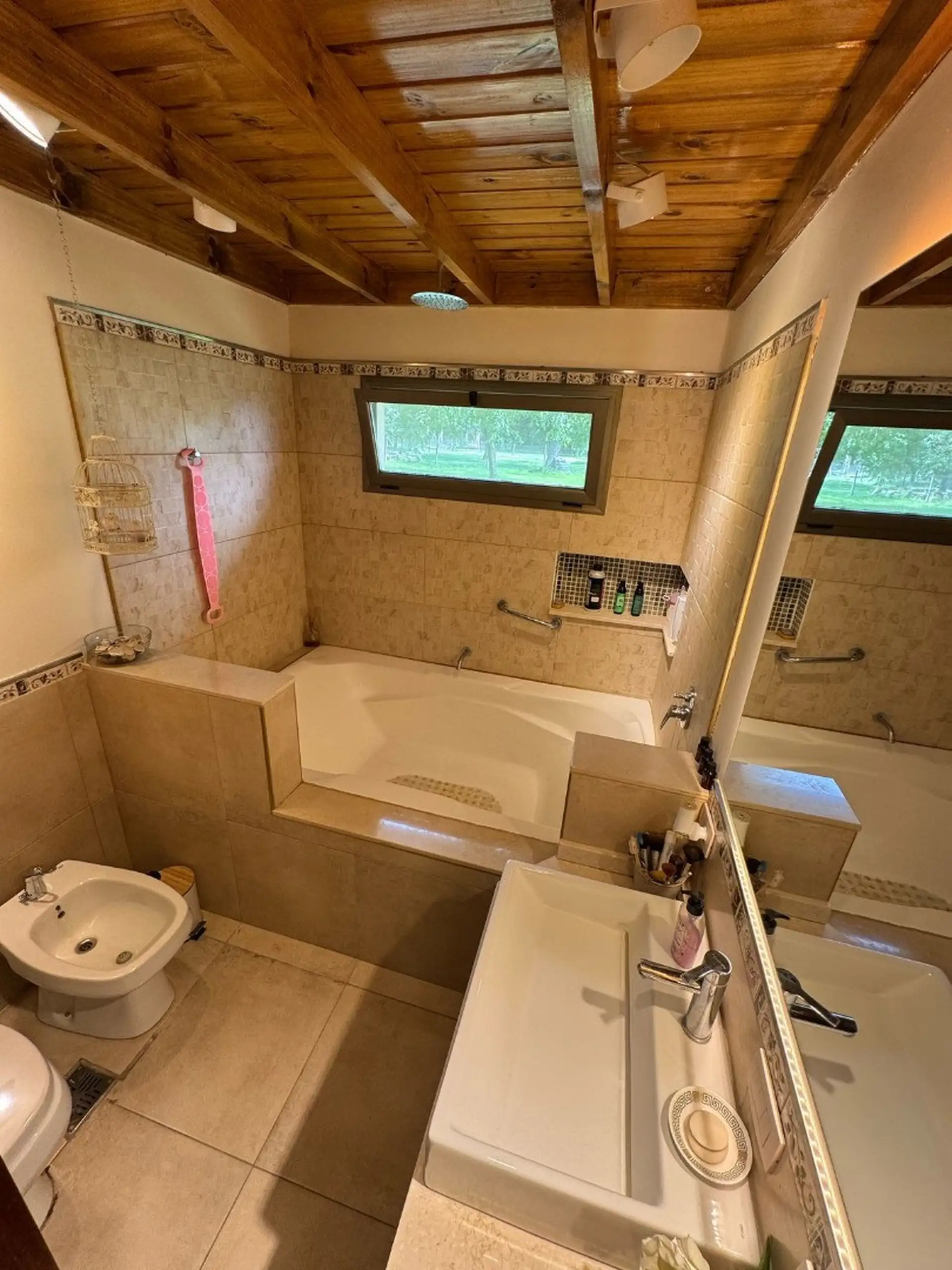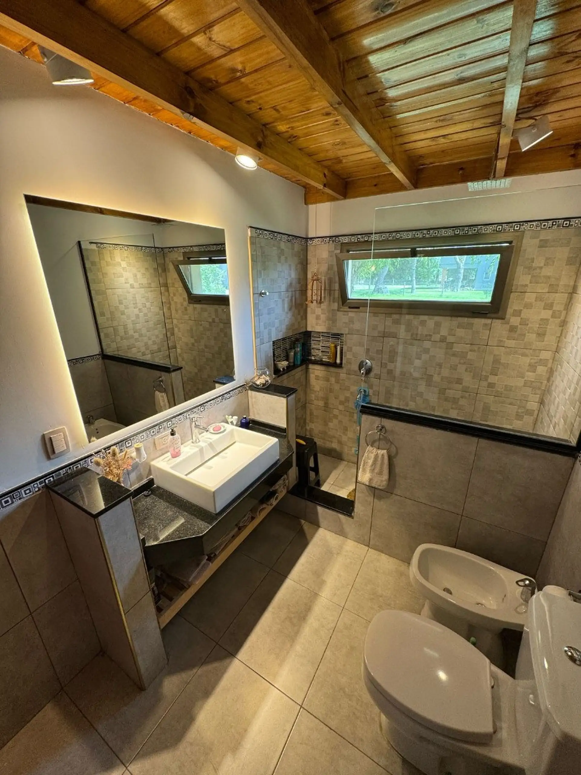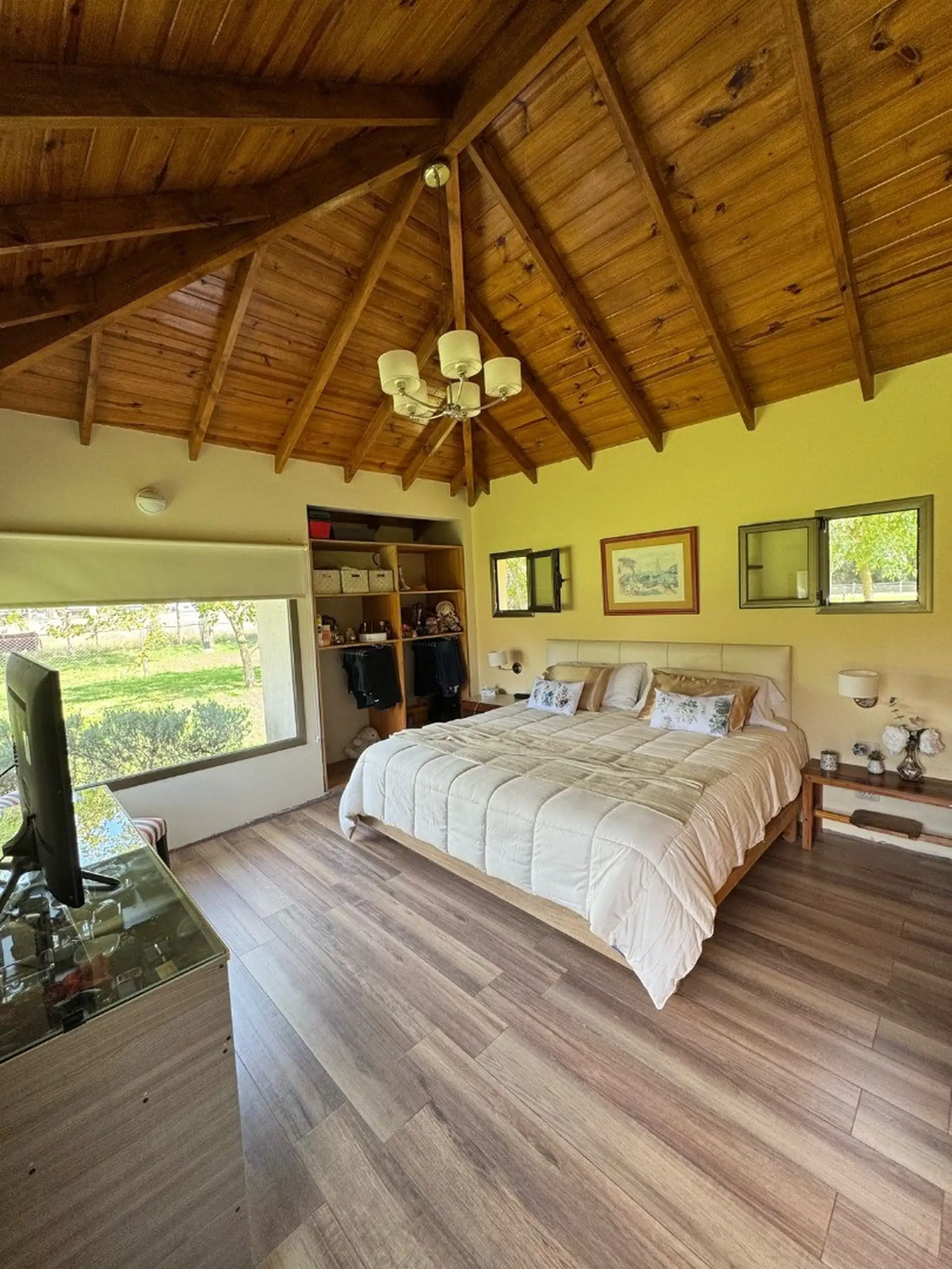 Al ingresar nos encontramos con el living, el cual tiene un amplio ventanal con vista al parque verde, hogar a leña, a la derecha se encuentra los dos dormitorios con baño compartimentado y el dormitorio principal con vista abierta al parque verde y con baño en suite , todos los dormitorios con amplio placar. Los baños tienen luz dicroicas y luz en el espejo.
